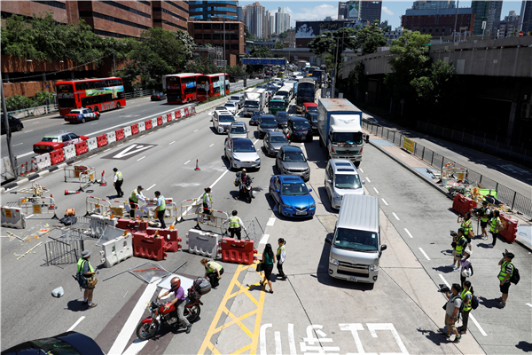 示威者一度用雜物堵塞紅磡海底隧道,工人其後移走攔路的路障。 路透社