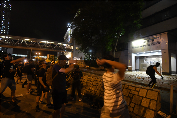 入夜後仍有示威者衝擊天水圍警署,不斷拋擲雜物。記者崔俊良攝
