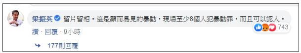 全国政协副主席、香港特区前行政长官梁振英也跟帖指出:“留下影片照片,这是显而易见的暴动,现场至少8个人犯暴动罪,而且可以认人。”