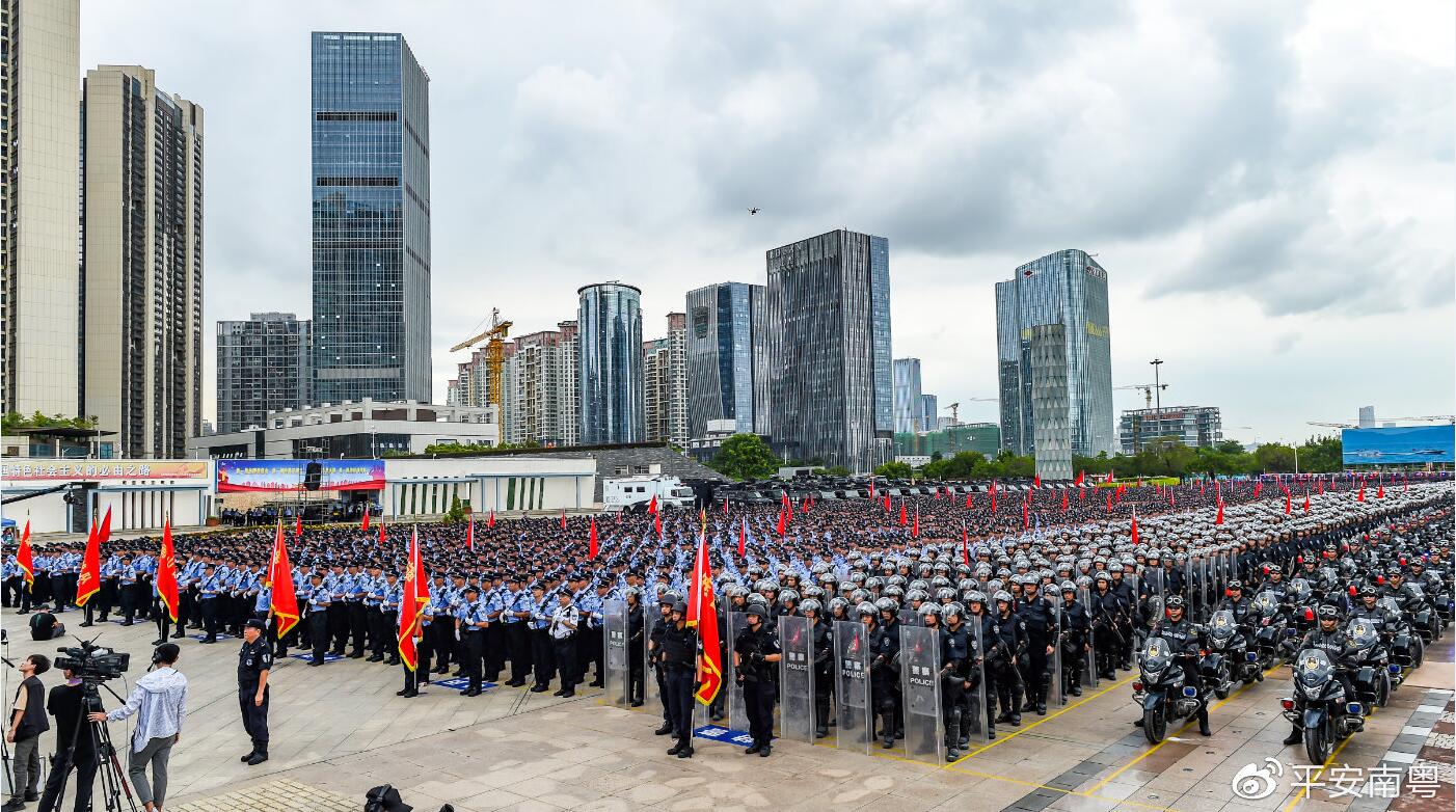 鏗鏘誓言,穿破長空。深圳市副市長、公安局長徐文海現場領誓:「我宣誓,不忘初心,牢記使命,對黨忠誠,服務人民……踐行新使命,忠誠保大慶。」1.2萬警力齊宣誓,誓言激盪回響,喊出了錚錚鐵骨、攻堅克難的警威氣勢,喊出了敢打必勝、使命必達的莊嚴承諾。主場地行動結束後,參訓警力兵不卸甲,分東、南、北三條線路奔赴到全市治安一線展開武裝巡邏。
