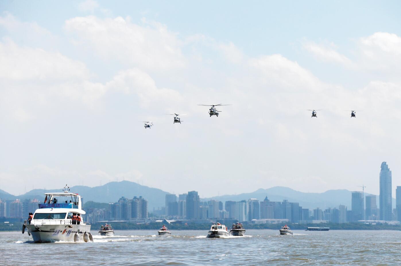 記者在現場看到,1.2萬名警力整齊集結,裝備精良,50輛裝甲車,200輛衝鋒車,1200台鐵騎摩托車,5架直升機,8艘船艇、2輛水陸兩棲車以及其他裝備分列周圍,海陸空齊上陣,氣勢磅礴,場面震撼。