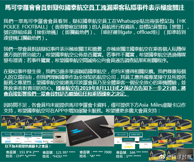 刚刚,国泰航空常客俱乐部“马可孛罗会”的多名会员联名发表声明,对国泰航空泄露香港警察足球队人员航班信息一事表示极度关注,要求国泰航空开诚布公向会员通报此事的调查结果和相关程序。这份声明还表示,如果国泰未能在8月11日或之前给出告知下一步行动的计划,将直接影响直接会员继续信任和搭乘国泰的决定。