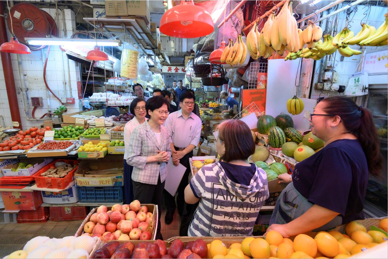 林鄭月娥(左二)昨到訪大圍街市了解改善工程進展,並與商販交談。