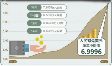 【香港商報网訊】在人民幣兌美元即期匯率跌破7之後,人民幣兌美元匯率中間價離7也僅有「一步之遙」。中國外匯交易中心7日將人民幣中間價下調313個基點,報6.9996,創2008年5月15日以來最低,這也是人民幣中間價連續第五個交易日走低。