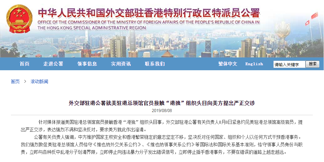 【香港商报网讯】据外交部驻香港特别行政区特派员公署网站消息,针对媒体报道美国驻港总领馆官员接触香港“港独”组织头目事,外交部驻港公署有关负责人8月8日紧急约见美驻港总领馆高级官员,提出严正交涉,表达强烈不满和坚决反对,要求美方就此作出澄清。