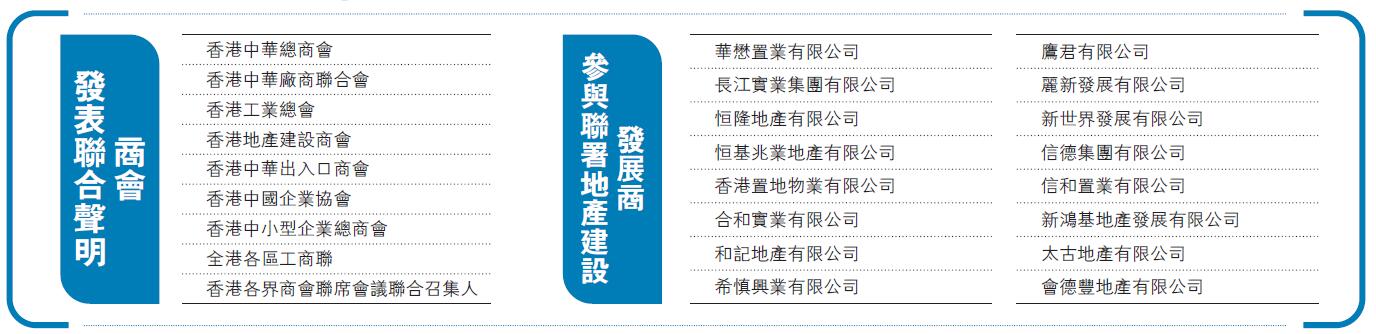 聯署會員包括:華懋、長實、恒隆、恒基、置地、合和、和記、希慎、鷹君、麗新、新世界、信德、信和、新鴻基、太古及會德豐。