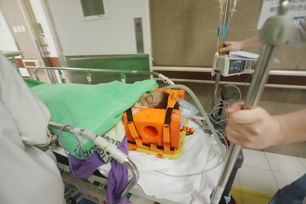 警方在車禍現場封路調查。下圖為受傷婦人半昏迷送院搶救。記者區天海攝