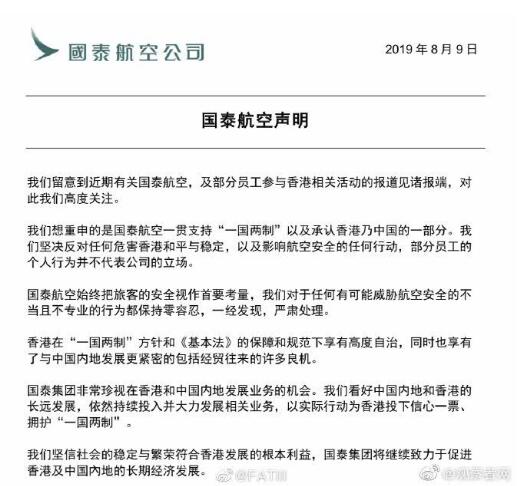 国泰航空发布声明称,公司一贯支持“一国两制”以及承认香港乃中国的一部分。坚决反对任何危害香港和平与稳定,以及影响航空安全的任何行动,部分员工的个人行为并不代表公司的立场。国泰集团非常珍视在香港和中国内地发展业务的机会,并看好中国内地和香港的长远发展,依然持续投入并大力发展相关业务,以实际行动为香港投下信心一票、拥护“一国两制”。