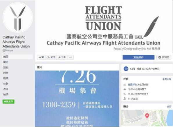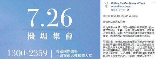 7月23日,一个名为“国泰航空空中服务员工会(CPAFAU)”的组织在社交媒体上公然呼吁航空业者于7月26日在香港国际机场集会,并对香港政府提出诸多要求。