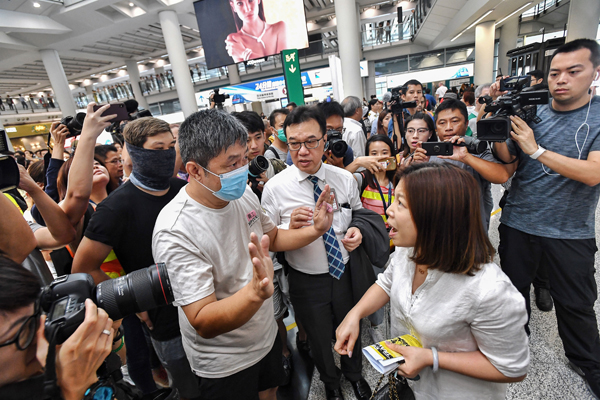 期間,有來接機的女士在集會場地與其他人理論,她認為年輕人是受外國及政客煽動,又批評集會人士不容許她發表意見。一位來自北京的旅客認為,集會人士阻塞大堂通道,又派發反修例傳單,影響香港及中國的形象。
