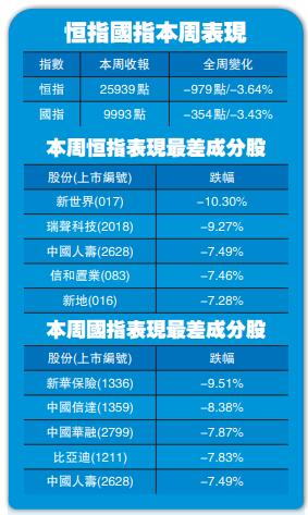 恒指整個星期累計跌979點,連跌三周累瀉2826點或9.8%。 中通社