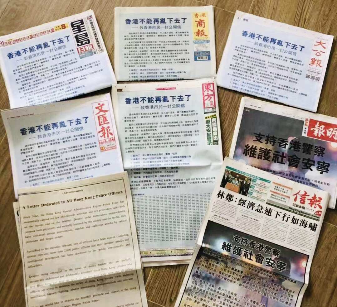 今天,香港多家報紙被“撐警”廣告霸屏!網絡圖片