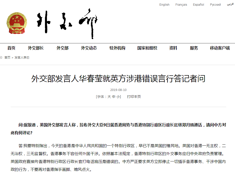 對英國外交大臣9日就香港局勢與香港特別行政區行政長官林鄭月娥通話一事,中國外交部發言人華春瑩表示,今天的香港是中華人民共和國的一個特別行政區,早已不是英國的殖民地。英國對香港一無主權,二無治權,三無監督權。香港事務不容任何外國干涉。