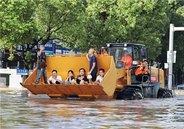救援人員涉水營救被困人員。 中新社