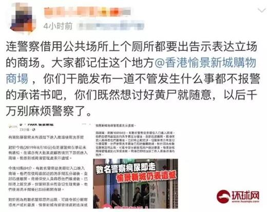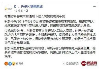 昨日,“香港警察穿防爆服进入商场被针对”事件引发关注,事发地香港“愉景新城”10日在脸书上发声明,称对警察进入商场引发顾客忧虑深感抱歉,令外界质疑警察进入商场上厕所是否还需要看商场保安的脸色。