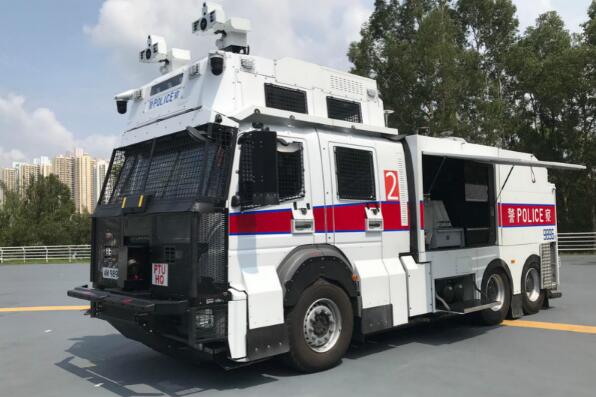 據介紹,警方斥資1660萬元購買的3輛水炮車,长8米、阔2.55米,車身配備兩個車頂噴水裝置、水箱及催淚溶劑儲水缸。