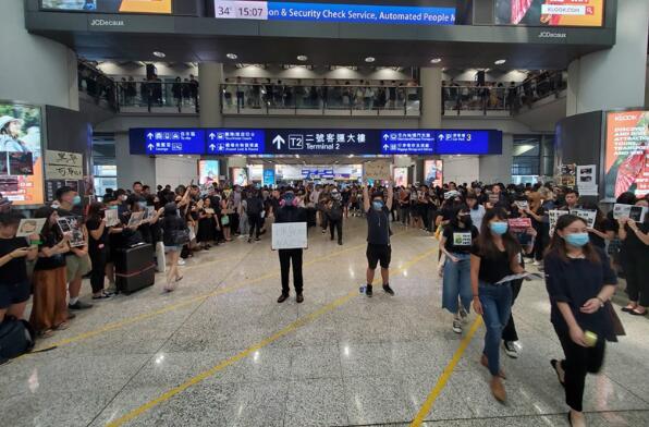 下午1时左右,机管局在入境大堂两旁,用铁栏划出予集会人士使用的指定范围,已坐满数百名身穿黑衣的示威者。他们向旅客派发自制的宣传单张,又播放多段在冲突期间警方驱散及制服示威者的片段。部分示威者还用眼罩遮盖右眼,声援昨日在清场行动中,右眼怀疑被防暴枪击伤的少女。集会人士不时高叫口号,吸引不少旅客及市民围观。