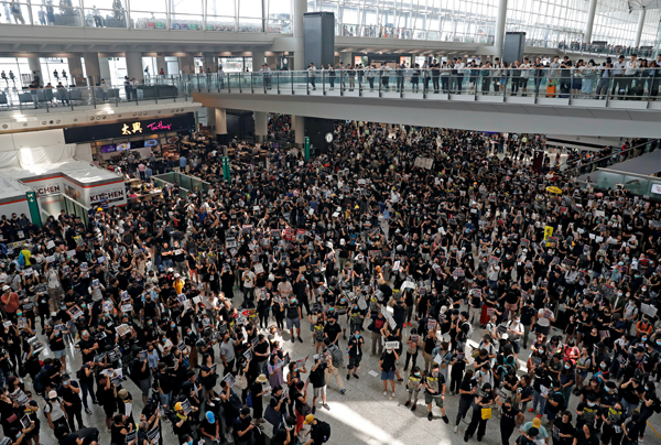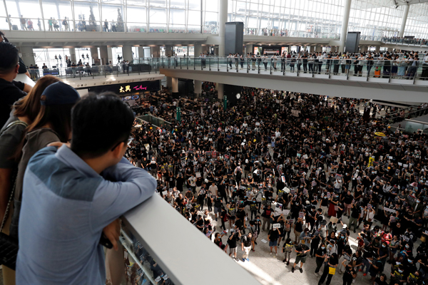 下午3時,身穿黑衣的示威者坐滿機場客運大樓接機大堂,有示威者更已突破臨時措施,衝入離境大堂。至下午約3時半,機場職員指,現時所有旅客已不可進入禁區。