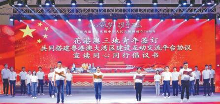 據悉,近年來,花都已經成為創新創業、實現夢想的熱土。為加強聯誼交流,支持粵港澳青年創新創業,大會向創美金谷‧粵港澳青年創新創業中心、花都數字文化青年創新創業基地、「廣州融創‧粵港澳青少年交流基地」授牌。為了讓港澳同胞更好地了解國情,大會還向香港、澳門鄉親社團、青年社團和友好社團贈送《我愛我家》國情宣傳手冊。隨後,花港澳三地青年簽訂共同搭建粵港澳大灣區建設互動交流平台協議,宣讀同心同行倡議書。