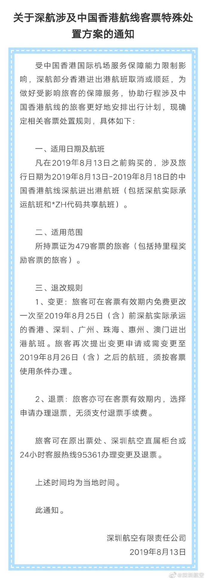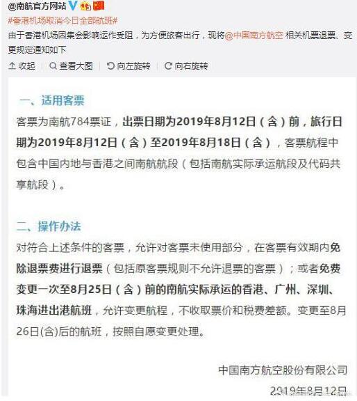 8月12日18时32分,中国南方航空股份有限公司官方微博@南航官方网站发布机票退票、变更规定通知。通知称,所有出票日期为2019年8月12日(含)前,旅行日期为2019年8月12日(含)至2019年8月18日(含),客票航程中包含中国内地与香港之间南航航段的南航784票证客票,均可免费退票,或免费变更一次至8月25日及以前的南航承运航班。