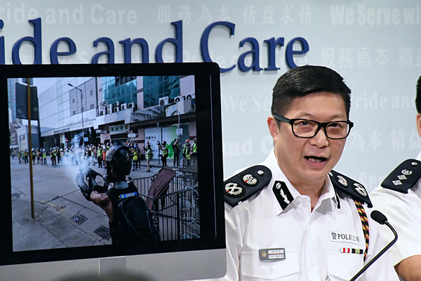 【香港商報网訊】記者戴合聲、林駿強報道:警方昨日舉行例行記者會,其中副處長鄧炳強首度出席。往日記者會只維持約1小時,昨日警方回應傳媒眾多提問,最終進行超過3小時。鄧炳強稱留意到有核心暴徒在過去的示威活動採取極端暴力行為,而警方以情報主導形式調查,包括喬裝成不同人士,並於前日在銅鑼灣拘捕15位核心暴徒,檢獲丫叉、鋼珠、雷射槍等證物。他批評激進示威者胡作非為,目無王法,以野貓式行動分散到各區,令廣泛市民受影響,甚至有人向警署、警員投擲汽油彈。他亦希望市民與暴力劃清界線,並強調警方與黑社會勢不兩立。