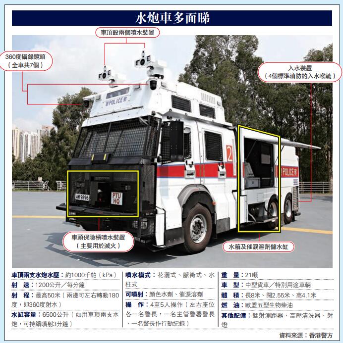 水炮車長8 米、寬2.55米,可容納5 人。中新社