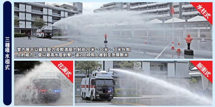 「停止衝擊,否則噴水將你們驅散」,在播放警告廣播後,警方分別用最低水壓至最高水壓,依次向設於20米、30米和40米三個距離的目標人偶噴水,在20米距離的最強水壓下,人偶可被沖出6至7米左右。