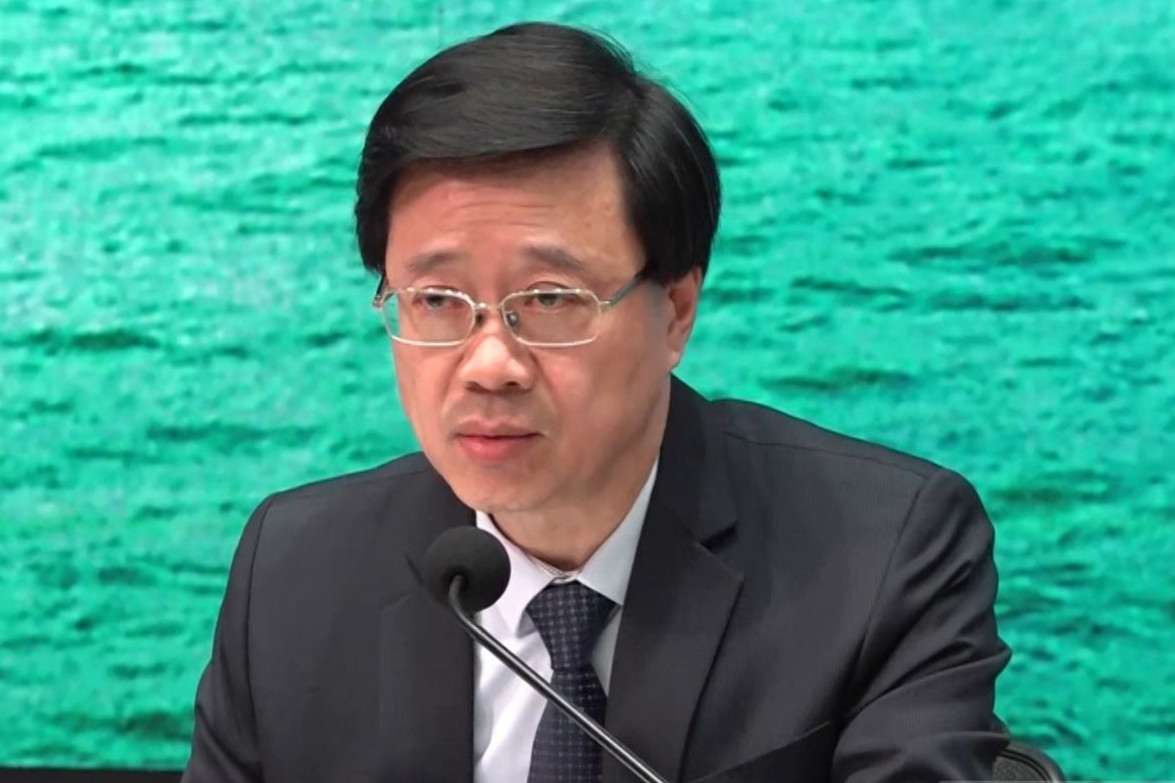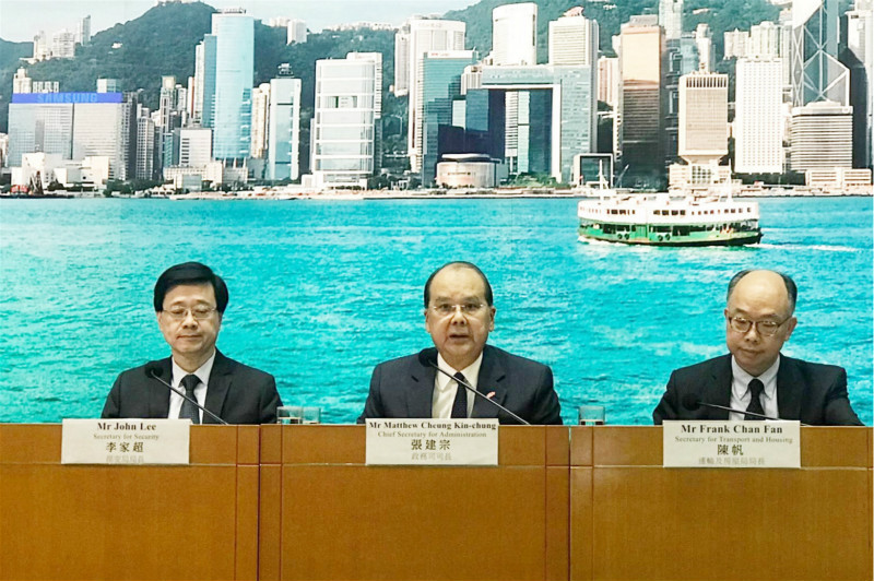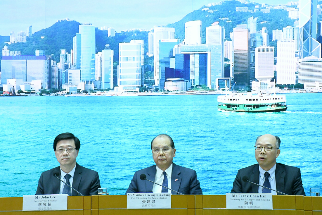 政務司司長張建宗(中)、保安局局長李家超(左)和運房局局長陳帆昨舉行記者會,指政府必須嚴厲譴責暴力,強調警方必須嚴正果斷執法。記者馮瀚文攝