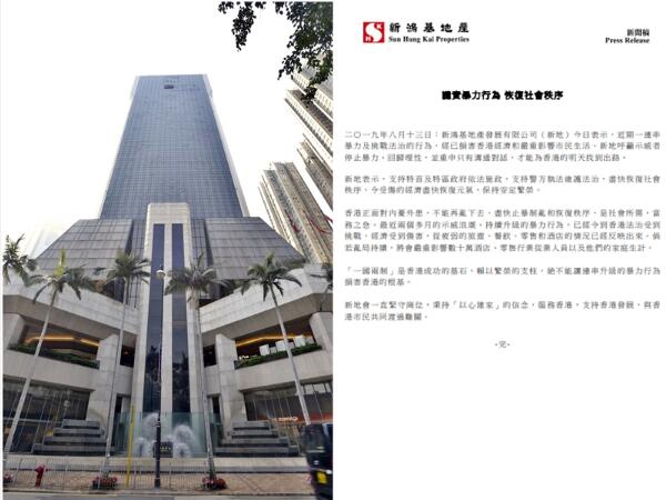 新鴻基地產(新地)今日發表聲明,指近期一連串暴力及挑戰法治的行為,經已損害香港經濟和嚴重影響市民生活,呼籲示威者停止暴力、回歸理性,並重申只有溝通對話,才能為香港的明天找到出路。