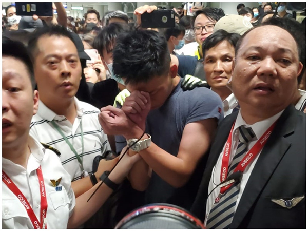 昨晚7時半,有黑衣人指一名來送機的內地男子可疑,竟從對方袋中取出其往來港澳通行證及內地身份證,並以其通行證上的「簽發機關」為「公安部出入境管理局」以及身份證「簽發機關」為「深圳市公安局福田分局」,就認定其為內地公安,遂指他喬裝成示威者來監視,逾百名黑衣人更包圍他,並用索帶將他雙手綁起再拳打腳踢,致其受傷倒地。