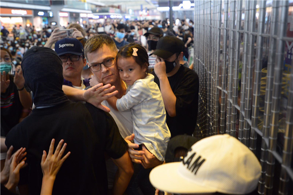 在離境大堂,一個四口之家被示威者故意阻住,母親最終在保安人員協助下帶同兩名兒子突破重圍通過閘口。她一度哽咽說,「我很心痛……我見到有人這樣,我很心痛。現在是左手打右手,自己腳踏自己腳。」