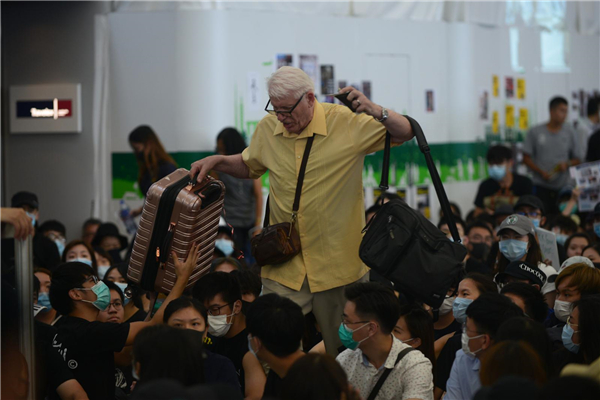 【香港商報網訊】記者馮仁樂報道:繼前天癱瘓香港國際機場後,大批黑衣示威者昨又在此發起非法集會及堵塞離境大堂,導致逾200班航班被取消,機場運作煞停。昨午,當大批黑衣人公然再堵塞進入機場禁區入口後,機管局無奈宣布,所有航班登機服務下午4時半暫停。期間,不少旅客不滿黑衣人如此做法,不時發生爭執及口角,期間有旅客受驚哭泣;亦有旅客要頭頂大件行李艱難通過坐在地上的黑衣人潮才能到達禁區入口。至深夜11時,黑衣人潮仍未散去。機場連續兩日被迫癱瘓,損失難以估計。入夜暴徒甚至對兩內地人士動用私刑,喪盡天良,與恐怖分子無異。