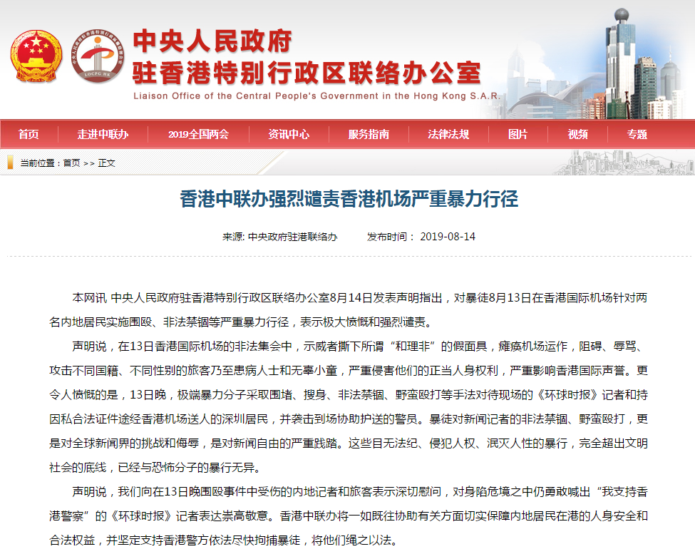 中央人民政府驻香港特别行政区联络办公室8月14日发表声明指出,对暴徒8月13日在香港国际机场针对两名内地居民实施围殴、非法禁锢等严重暴力行径,表示极大愤慨和强烈谴责。