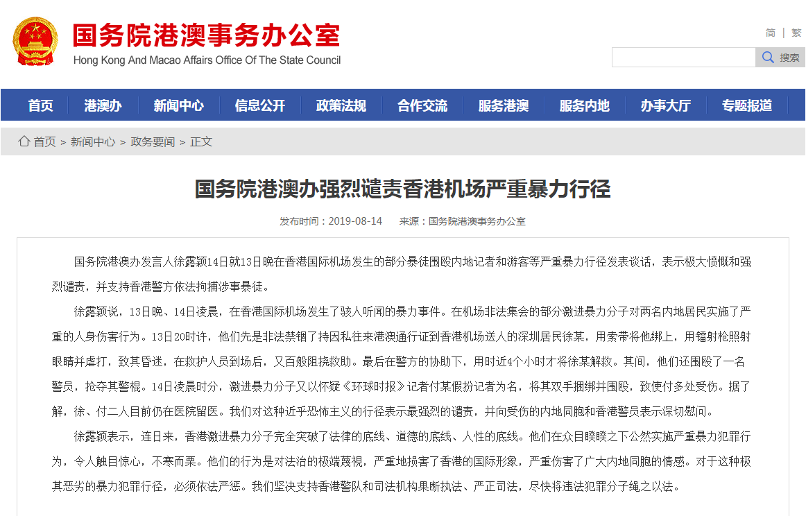 国务院港澳办发言人徐露颖14日就13日晚在香港国际机场发生的部分暴徒围殴内地记者和游客等严重暴力行径发表谈话,表示极大愤慨和强烈谴责,并支持香港警方依法拘捕涉事暴徒。