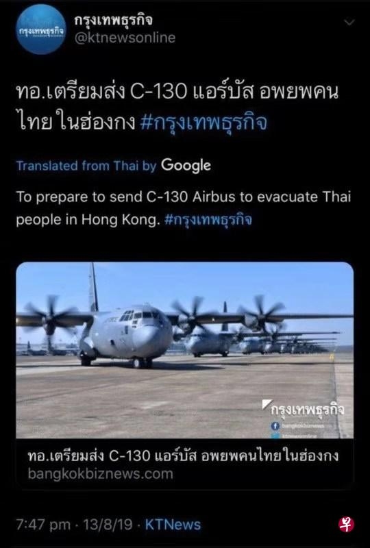 據《曼谷郵報》報道,若果香港機場的運作繼續受影響,泰國皇家空軍將派遣兩架飛機,一架C130運輸機及一架A340飛機,協助疏散在香港的泰國公民回國。