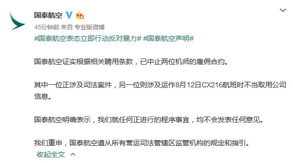 另外,國泰證實,根據相關聘用條款,已中止兩位機師僱傭合約。其中,一位正涉及司法案件,另一位則涉及運作8月12日CX216航班時不當取用公司資訊。
