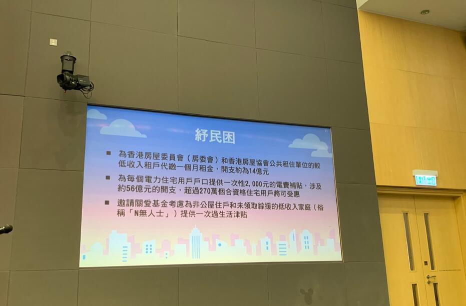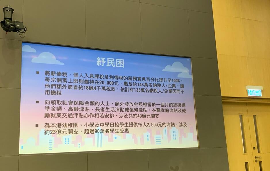至於紓民困方面,則包括寬免薪俸稅、個人入息課稅及利得稅;額外發放綜援、高齡津貼、長者生活津貼及傷殘津貼;向幼稚園、小學、中學學生提供2500元津貼;向較低收入的公屋住戶代繳一個月租金;一次性2000元電費補貼;向N無人士發放一次性生活津貼等。