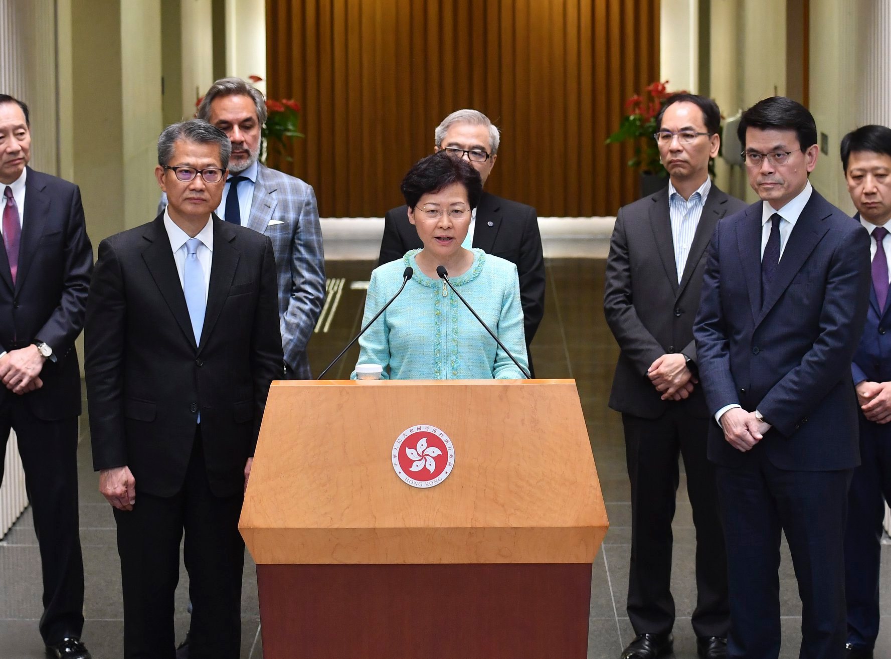她又表示,今日公布嘅措施,目的係紓困。要喺外憂內患嘅衝擊下回復元氣,當前最重要嘅係停止暴力,恢復社會秩序。近日香港多次出現以示威為名嘅暴力或者破壞活動,大家都感到十分痛心。她相信每一個珍惜香港嘅人,都唔會忍心見到香港被摧毀,因為香港呢個家你同我都「有份」,We all have a stake in Hong Kong!