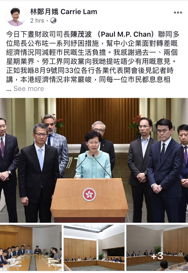 【香港商報网訊】昨晚,行政長官林鄭月娥於社交網頁Facebook表示,昨日政府公布一系列措施,目的是紓困,要在「外憂內患」衝擊下回復元氣,當前最重要是停止暴力,恢復社會秩序。她感謝過去一兩個星期業界、勞工界同政黨向她提出唔少有用的意見。正如8月9日同33位各行各業代表開會後見記者時講,本港經濟情況非常嚴峻,同每一位市民都息息相關。她相信每一個珍惜香港的人,都不會忍心見到香港被摧毀,因香港這個家大家都「有份」,並以英文指「We all have a stake in Hong Kong!」。