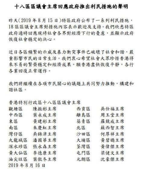 聲明最後說,十八區區議會主席會繼續共同努力,推動各項市民關心的議題,構建和諧社區。