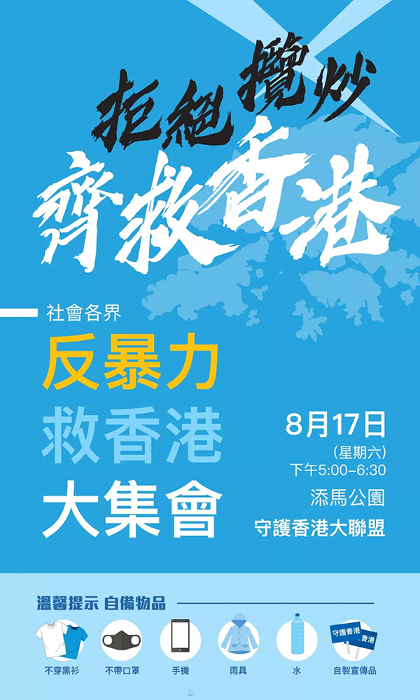 【香港商報網訊】記者林駿強報道:過去兩個月來,持續的暴力浪潮讓香港市民受夠了!守護香港大聯盟今日將在金鐘添馬公園舉辦「反暴力、救香港」大集會,表明「拒絕攬炒,齊救香港」。大會訴求包括停止無休的非法遊行集會、停止投擲汽油彈等暴力行為、停止「不合作運動」、停止破壞公共設施、回復守法傳統等。大聯盟呼籲參加者穿淺色衣服,不要穿黑衣及戴口罩,並歡迎大家自製標語。此外,大聯盟之後會繼續舉辦連串活動,包括延續全民撐警活動、舉行校園反欺凌反暴力活動等,讓社會可以充分表達反對暴力、維護安寧的心聲。