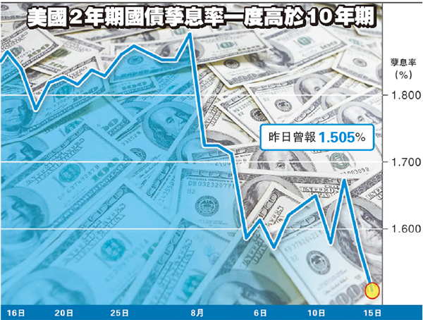 美國兩年期孳息終於高過十年期,即孳息曲線倒掛,預期美國未來將出現衰退,市場恐慌情緒急升,標普500與道指急跌,資金跑進避險資產。究竟孳息倒掛有多可怕?