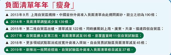 近年來,中國對外開放的大門越開越大,外資市場准入負面清單限制項目在不斷縮減。今年7月30日,2019年版《全國和自貿試驗區外商投資准入負面清單》正式生效,外資進入船舶代理、城市燃氣、電影院、演出經紀機構、油氣勘探開發等限制將進一步被放寬或取消。據統計,全國和自貿試驗區兩張負面清單的限制措施已相應地縮減到40條和37條。