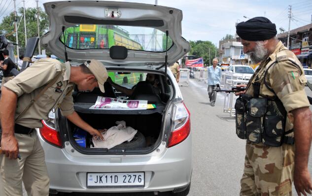 8月14日,在印控克什米尔查谟,士兵在街头检查站检查过往车辆。新华社发