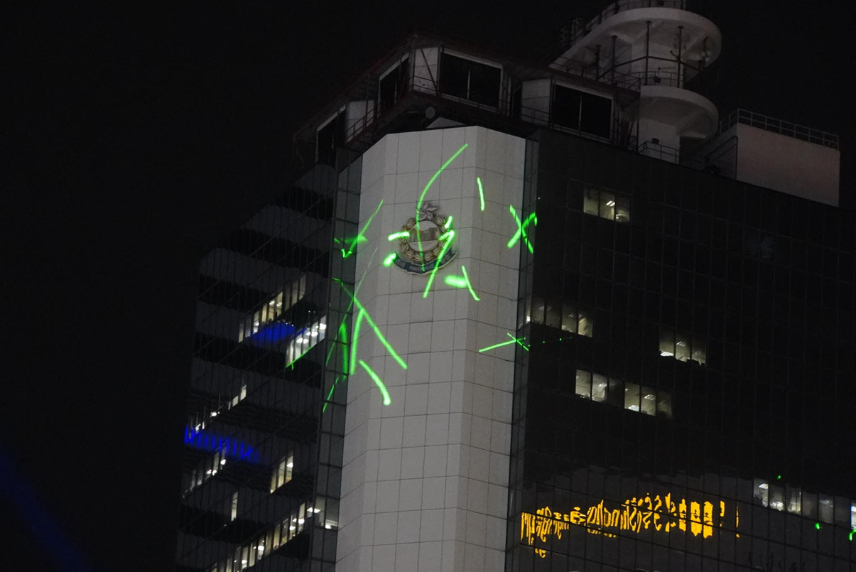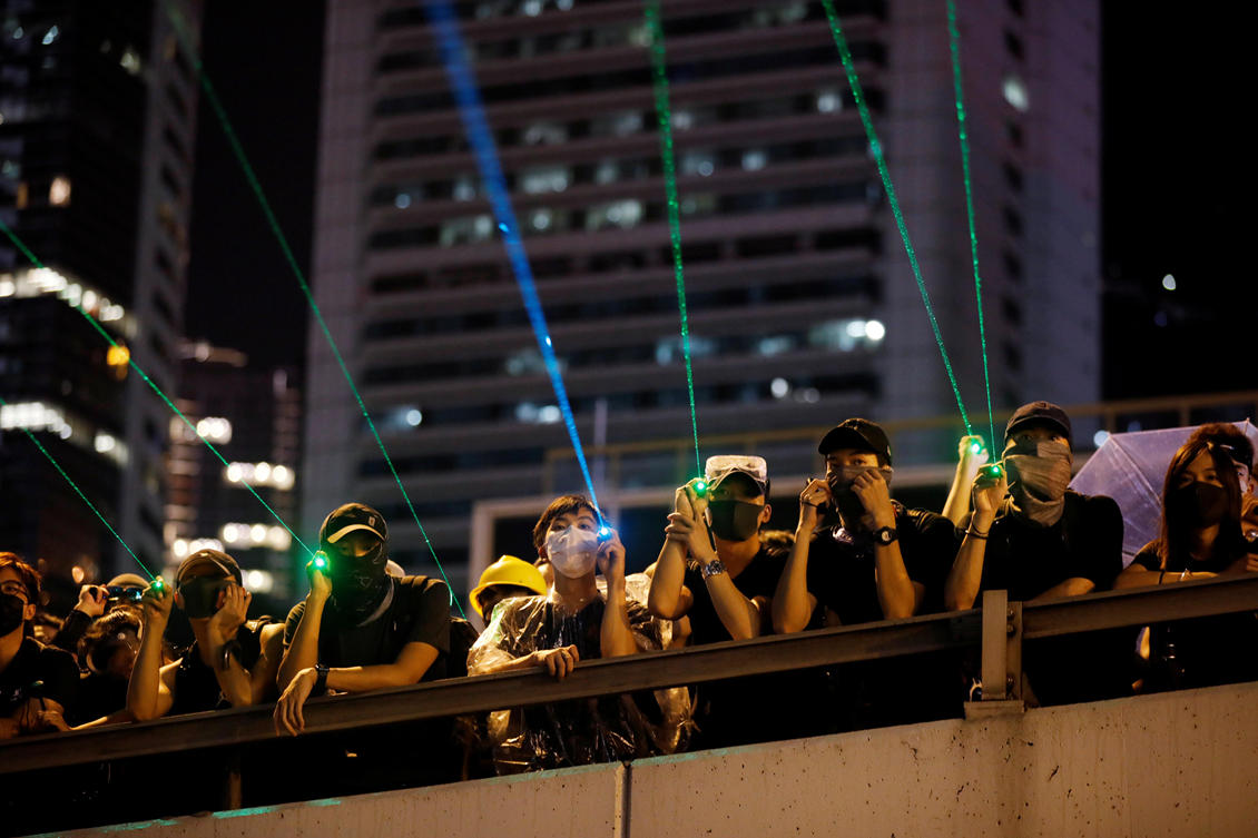 示威者用鐳射抢射向政府總部。记者冯瀚文摄