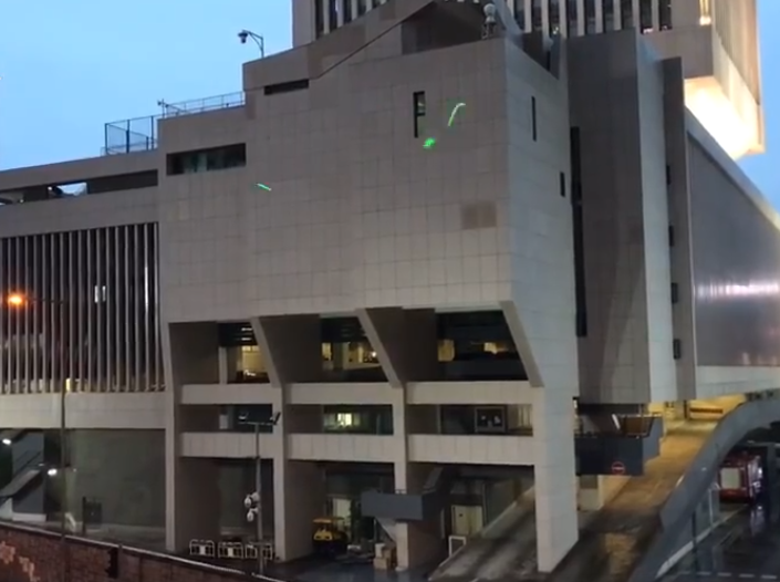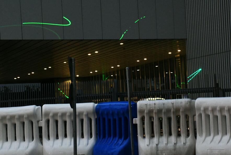 有黑衣暴徒以鐳射燈照射中環駐港部隊總部。