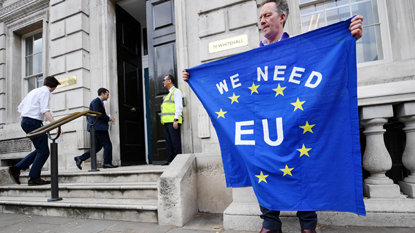 一名示威者在英國內閣辦公室外抗議,要求約翰遜政府重新與歐盟談判,不要讓英國硬脫歐。網絡圖片