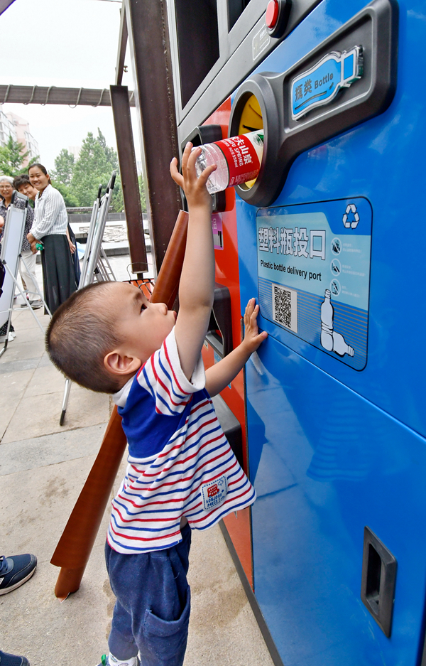一名孩童將塑料瓶放進智能回收設備。新華社