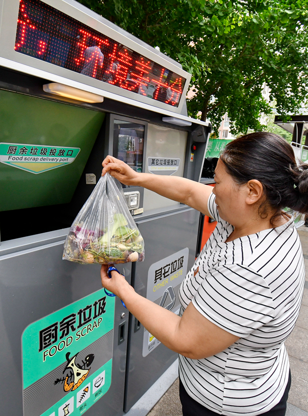 北京社區一名居民將廚餘垃圾投放進智能回收設備。新華社