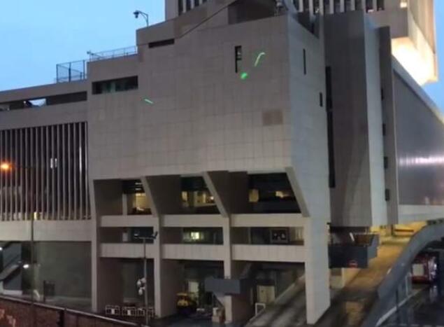 图为18日示威者用镭射枪挑衅解放军驻港部队总部(来源:香港商报网)